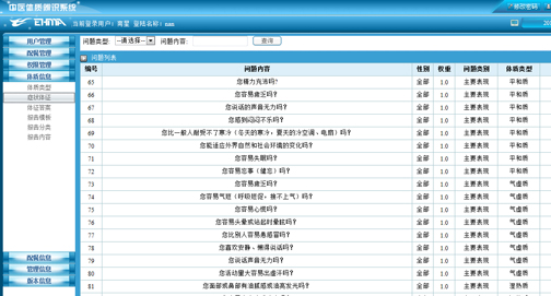 EHM中医体质辨识软件是判断中医体质分类的标准化工具,依据中华中医药学会《中医体质分类与判定》标准开发。软件是在中医体质理论指导下,根据量表设计原理,以问询录入的方式,采集居民健康信息;通过对9种体质分值的结果分析,来判断体质类型。主要应用于各级医疗机构进行中医体质检测。功能特点 中医体质辨识软件具有操作简便、批量检测、报告科学、方案详实等特点,为医疗机构中医预防保健工作必备的软件之一。